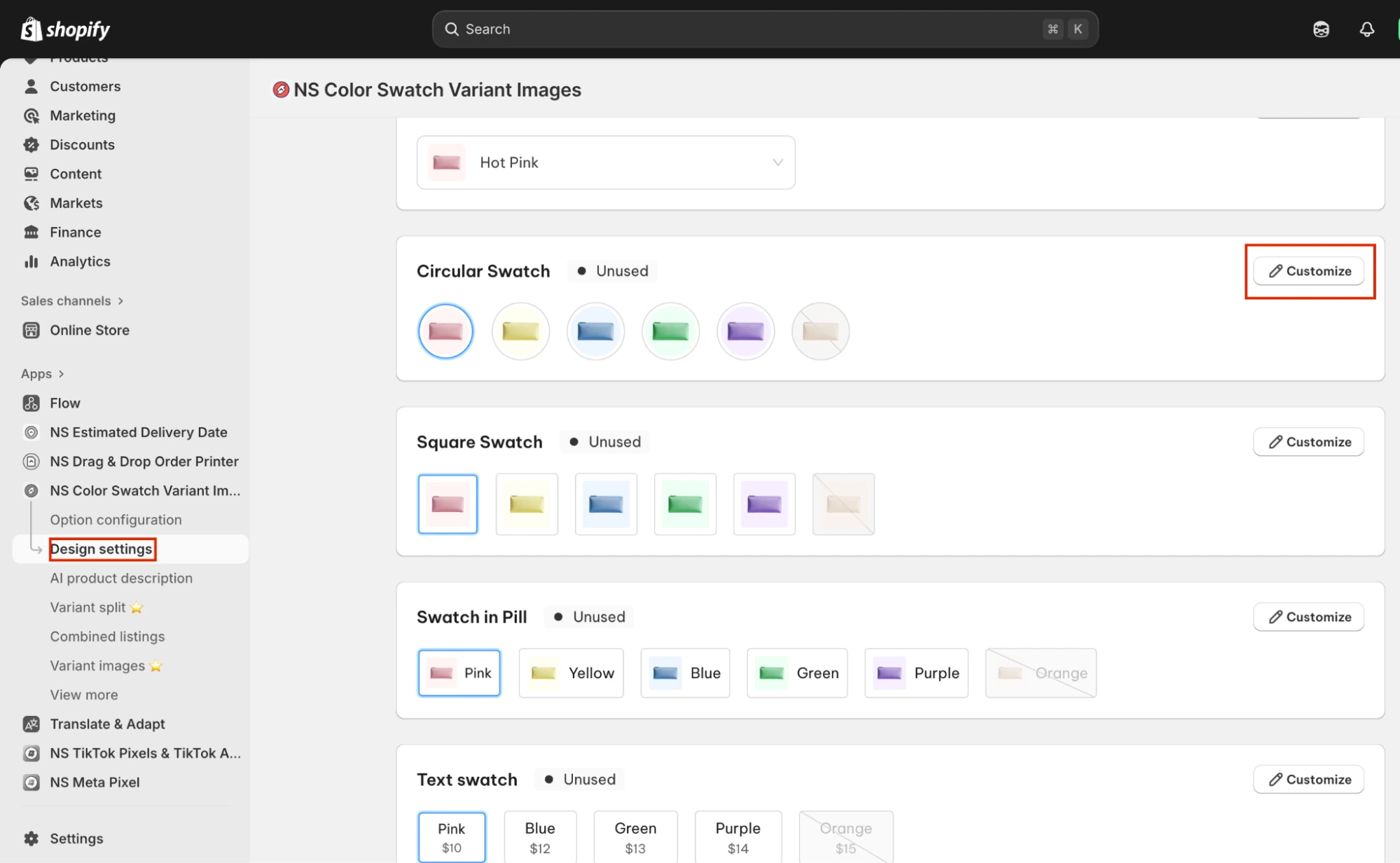 2. You’ll see a list of swatch styles, find the one you want to use for your swatches, and click Customize.