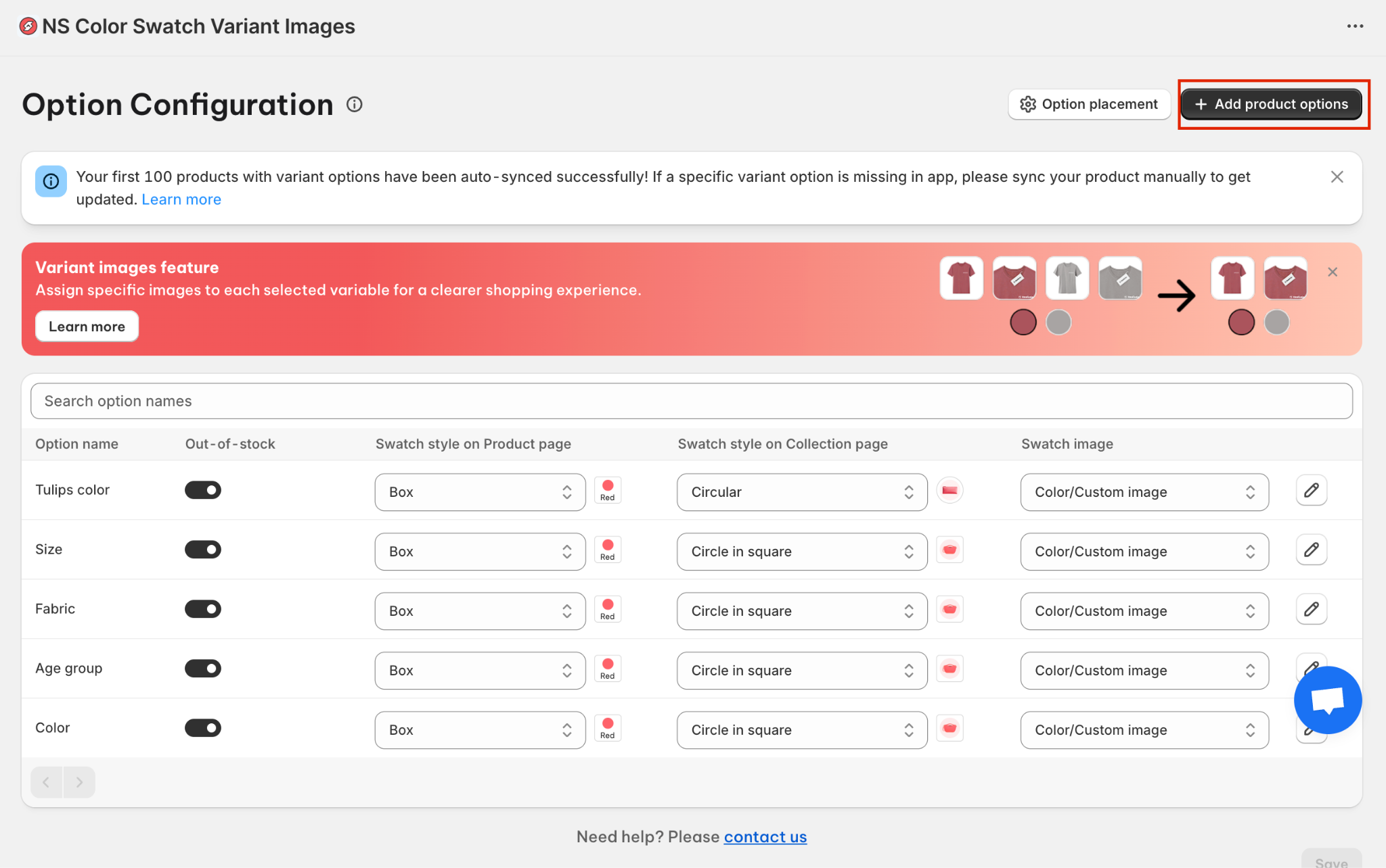 2. Head to Option Configuration, the app automatically syncs options from your latest 100 products here.