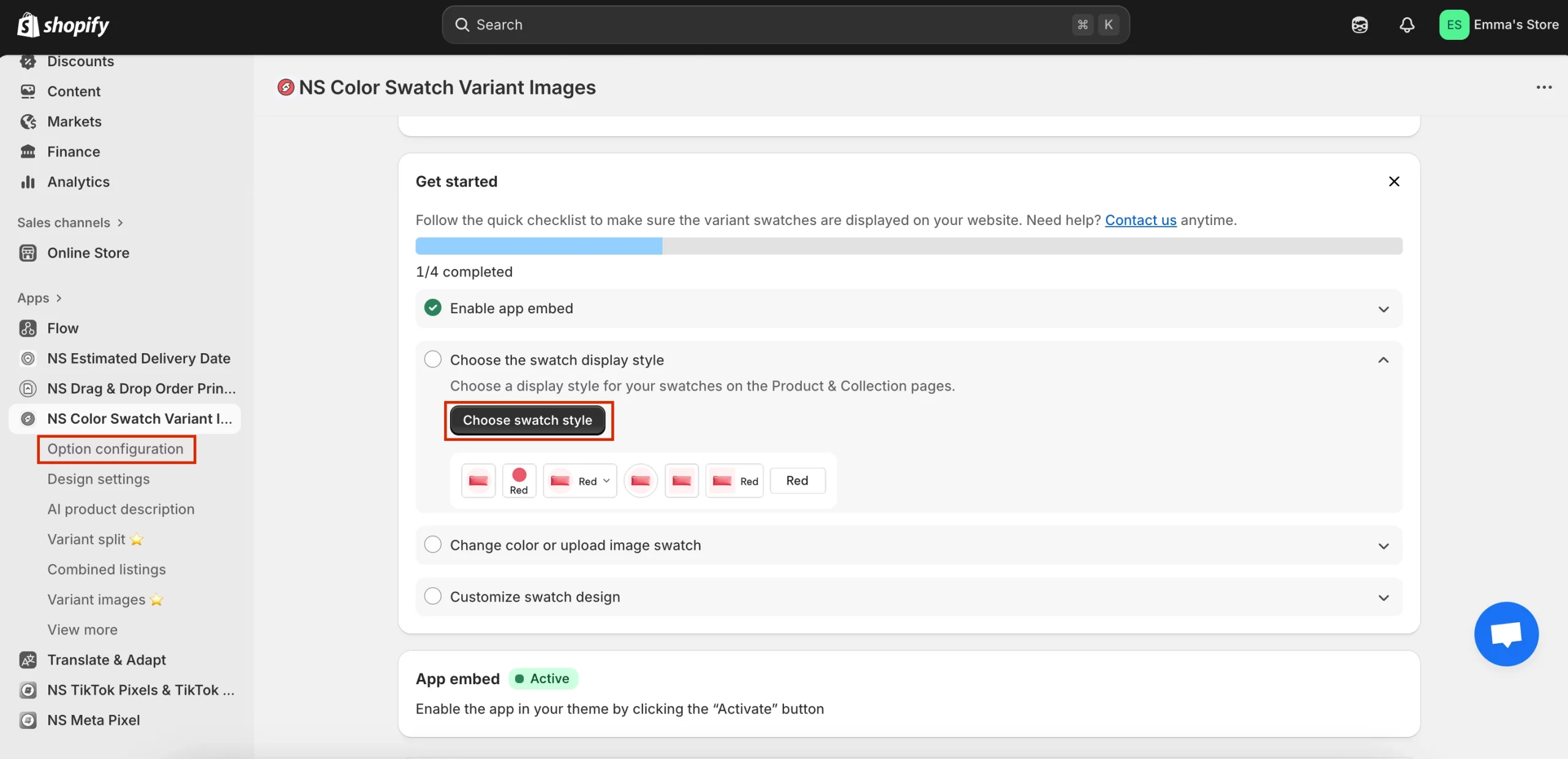 1. From the Instructions page in the app, click Choose Swatch Style, or head straight to Option Configuration from the left menu.