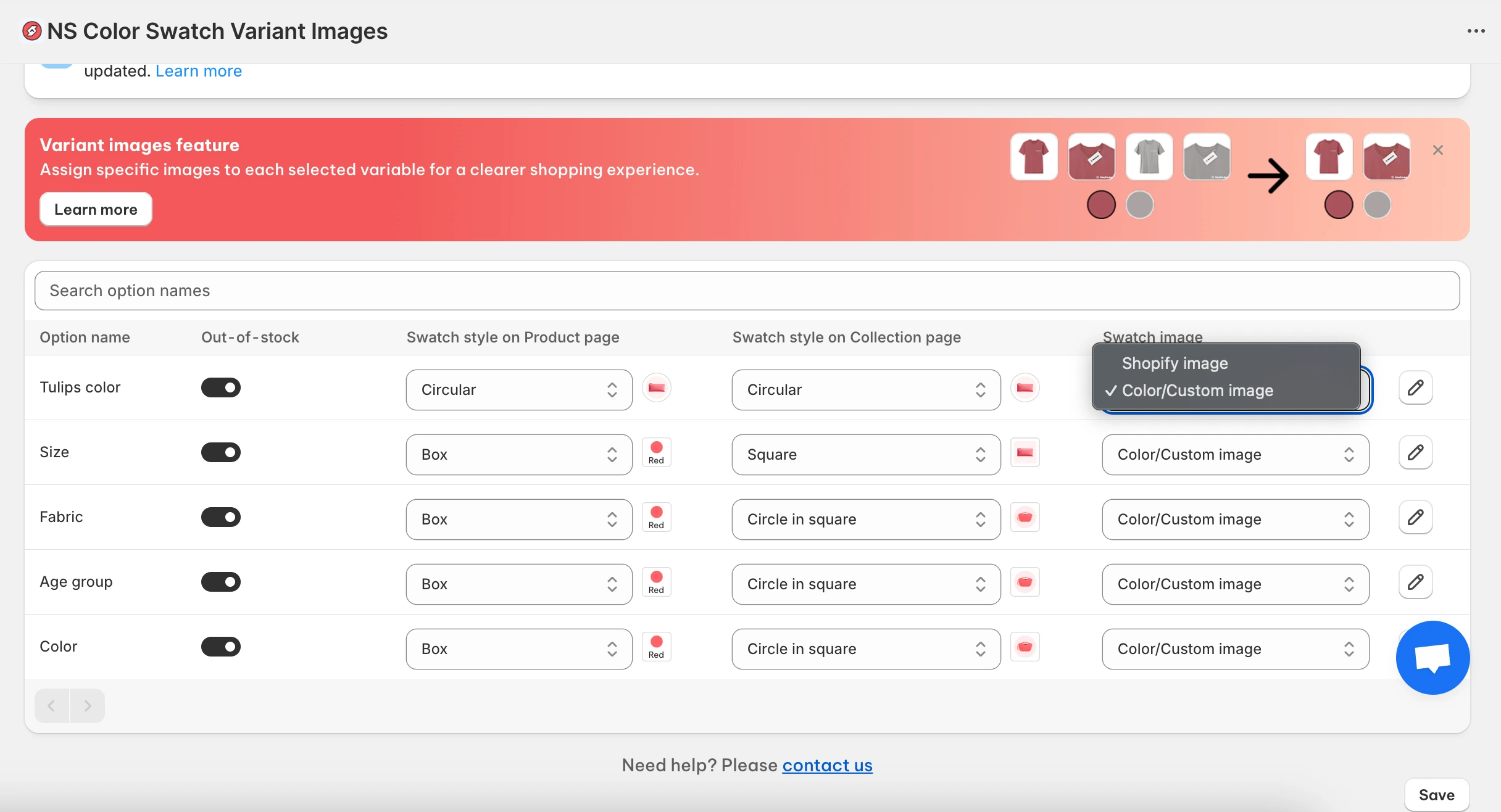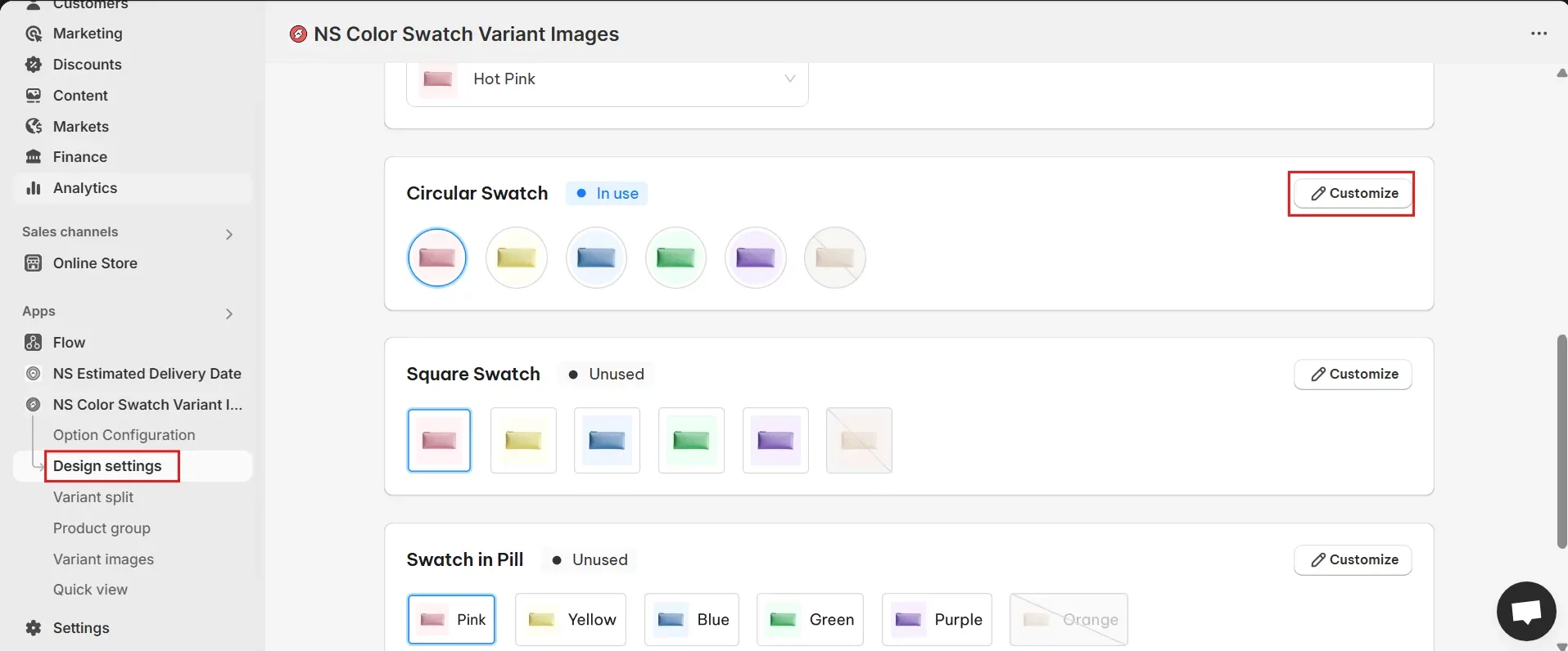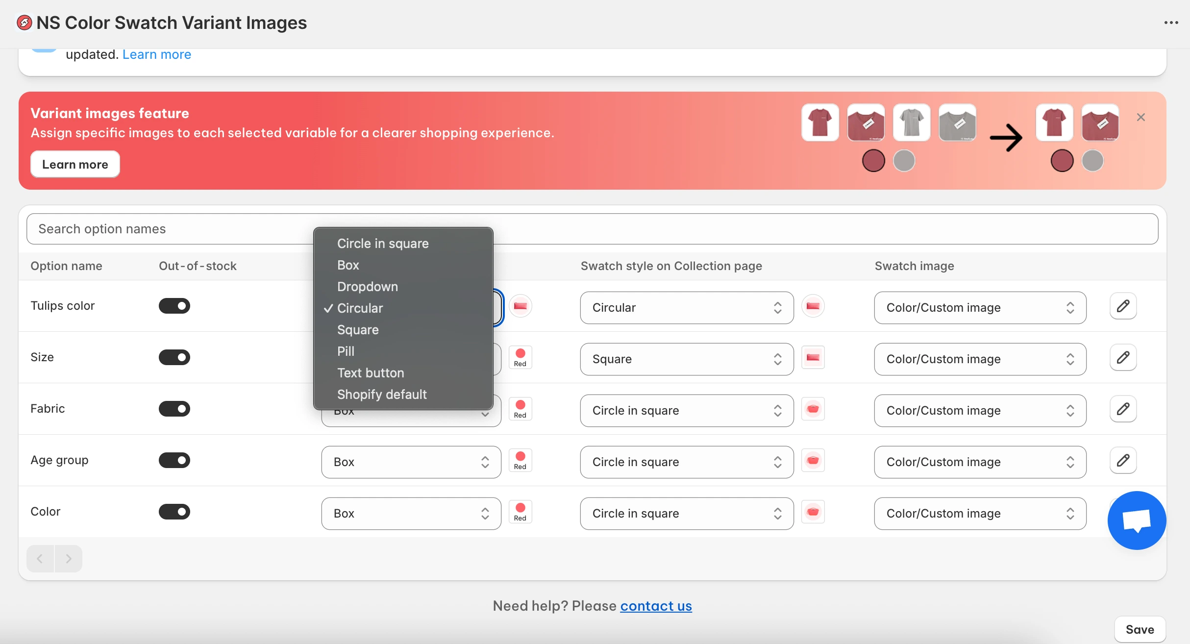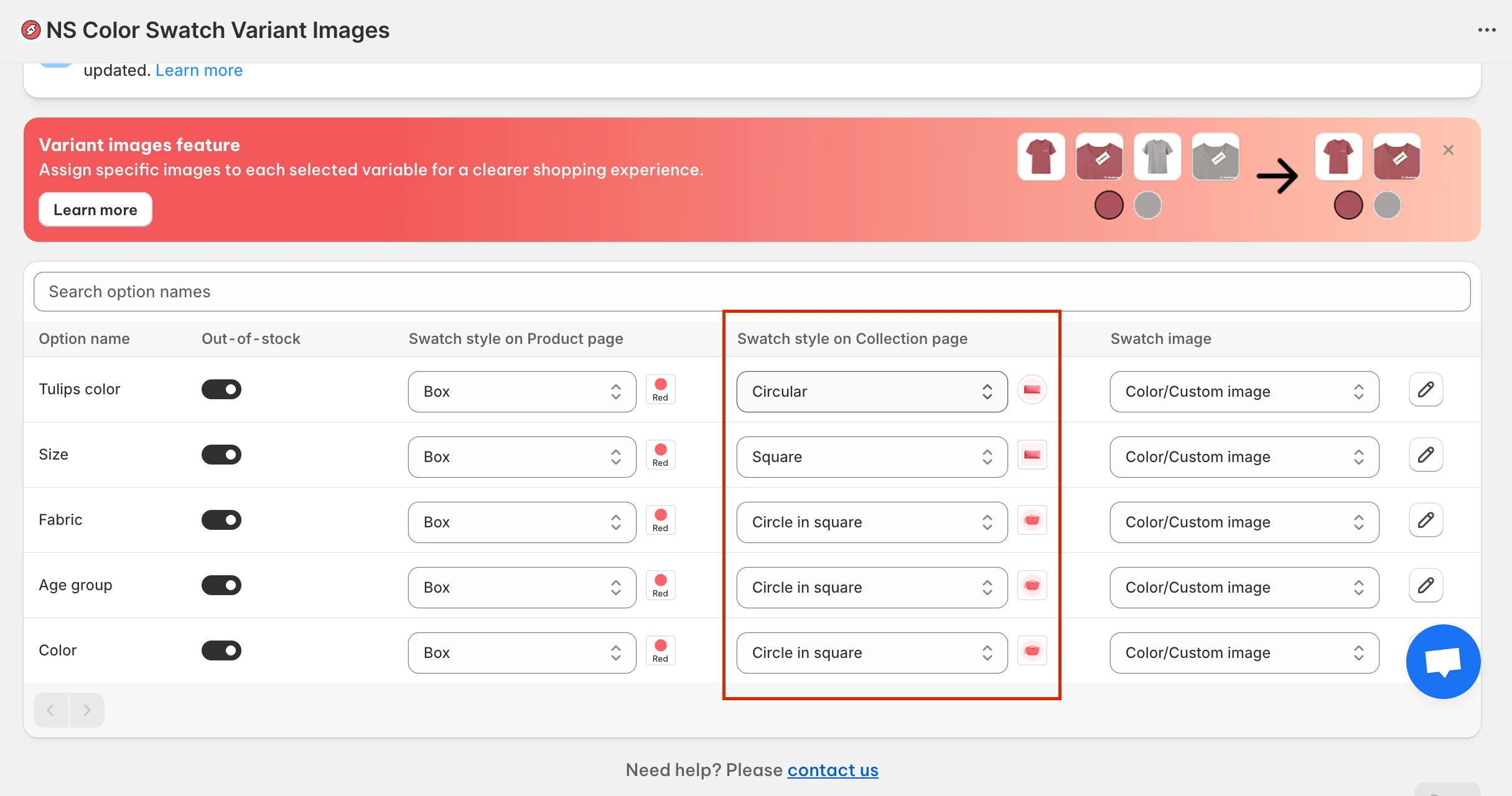 Here you’ll choose the shape and style for your swatches through a dropdown with multiple options like squares, circles, pills, etc.