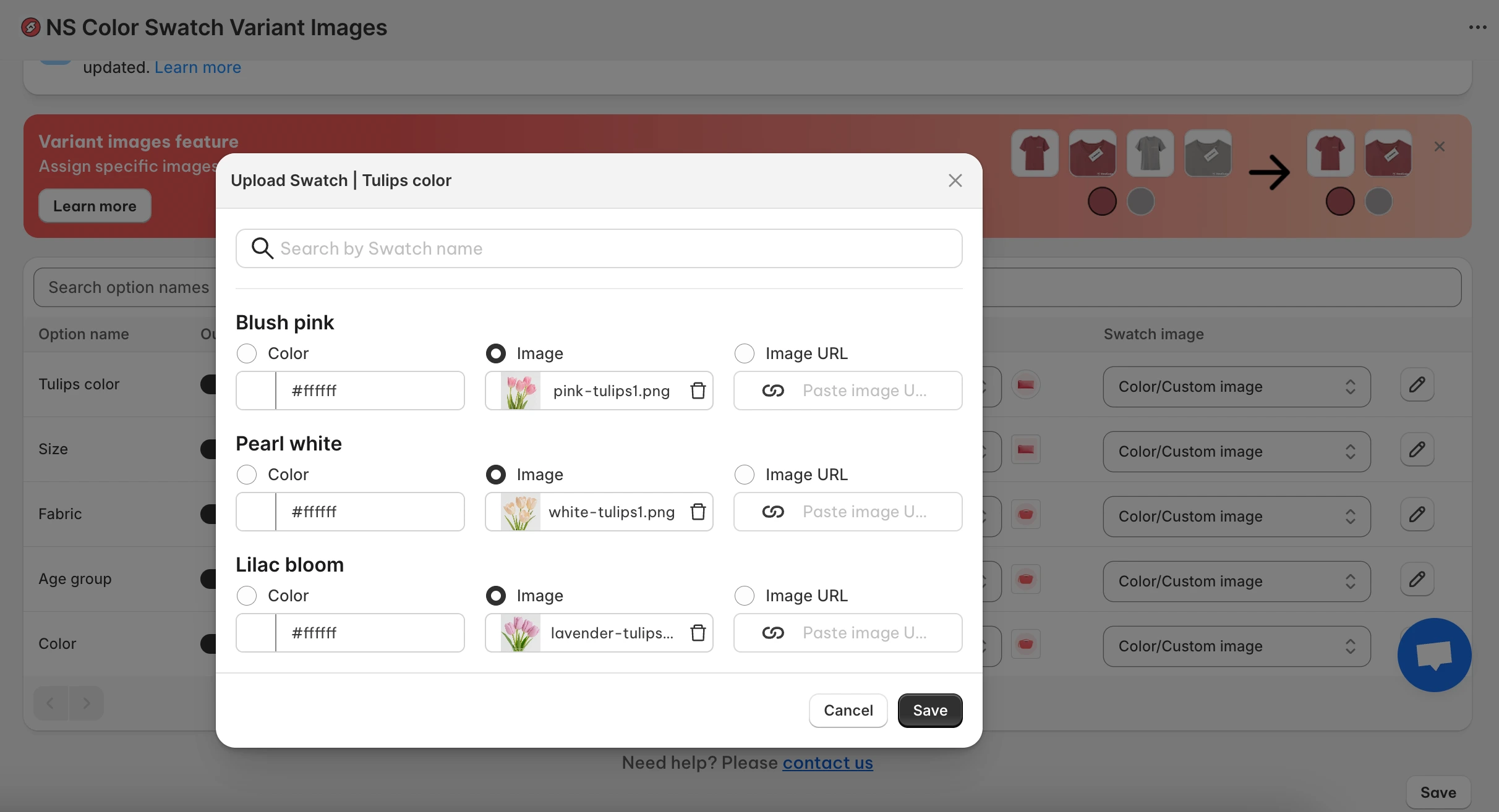 6. If you choose Option 2, click the pencil ✏ to open color picker or upload variant images from your computer.