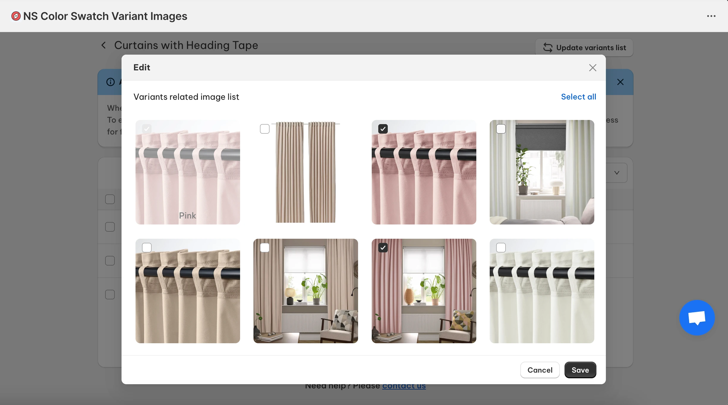 6. In the pop-up window, set the color or upload an image for each variant. Double-check that each swatch is linked to the correct variant name.