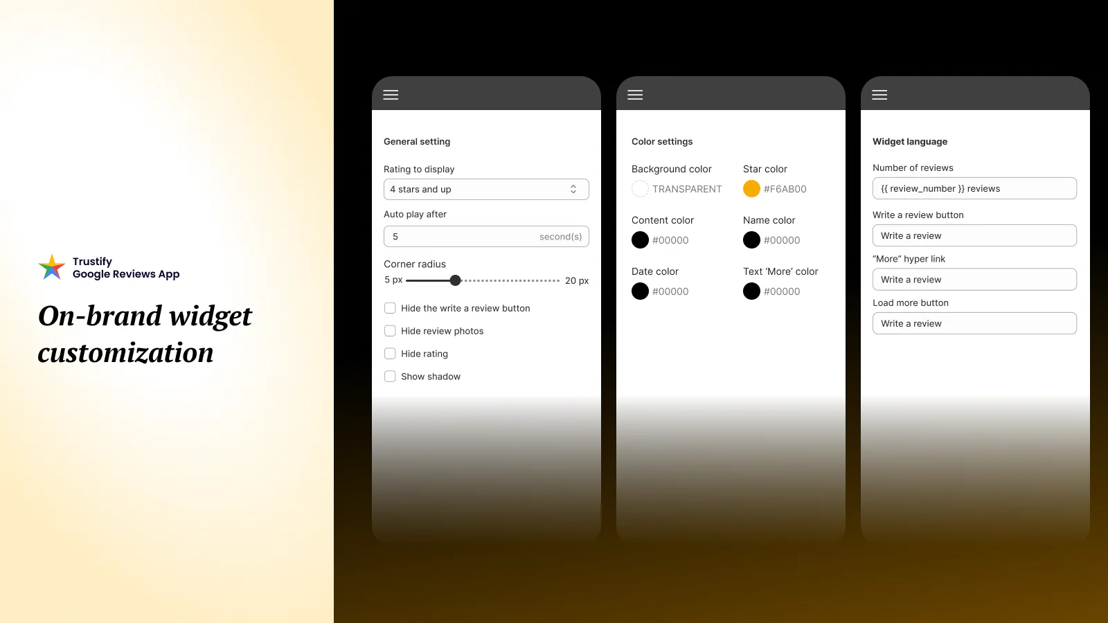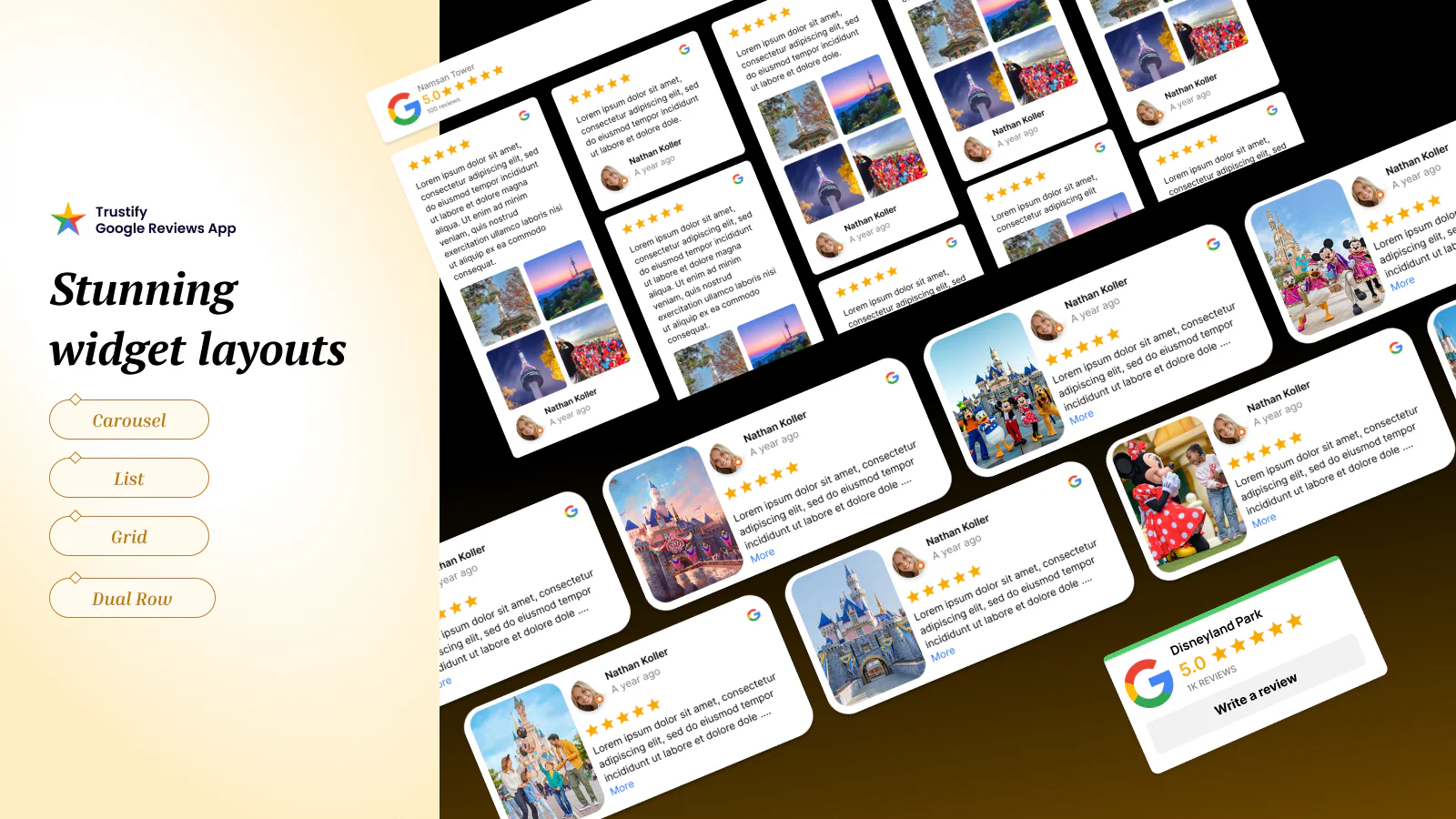 - Choose from 8 customizable, no-code review widget layouts